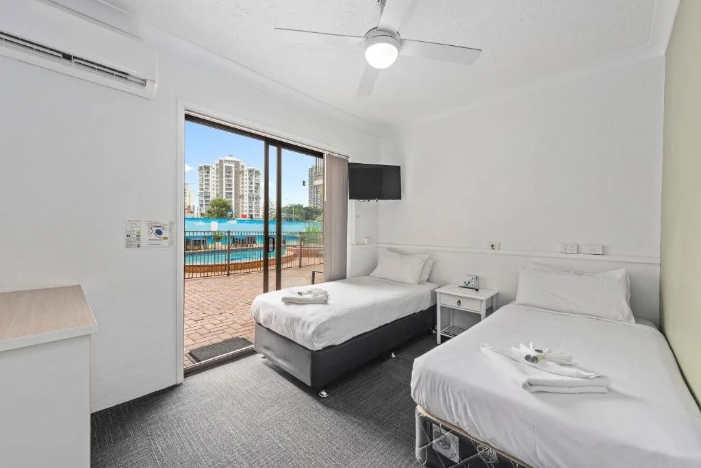 Discover the spacious Twin Room, perfect for friends or family. Featuring two comfy beds, a private ensuite, and a handy dining table/bench, this room has everything you need for a delightful stay.